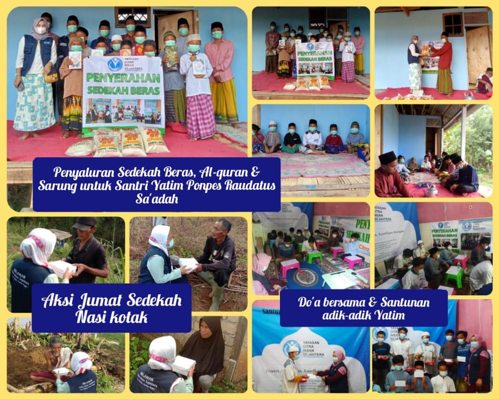 Syukur Alhamdulillah Kepada Allah SWT atas izin dan kurnia-NYA, Telah terlaksana penyaluran sedekah beras, Al Qur’an dan Sarung, Santunan & do’a bersama adik2 yatim serta aksi sedekah nasi kotak Berikut kegiatannya :